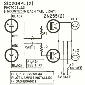 Este circuito para el automóvil utiliza LDR como sensores y no necesita estar conectado a la lámpara. El circuito es de una revista Radio Electronics de abril de 1961.