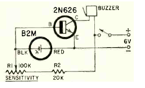 Este circuito utiliza el 2N626, el primer transistor Darlington comercial. Lo encontramos en la revista Radio Electronics de junio de 1961. El sensor es una fotocélula de la época.