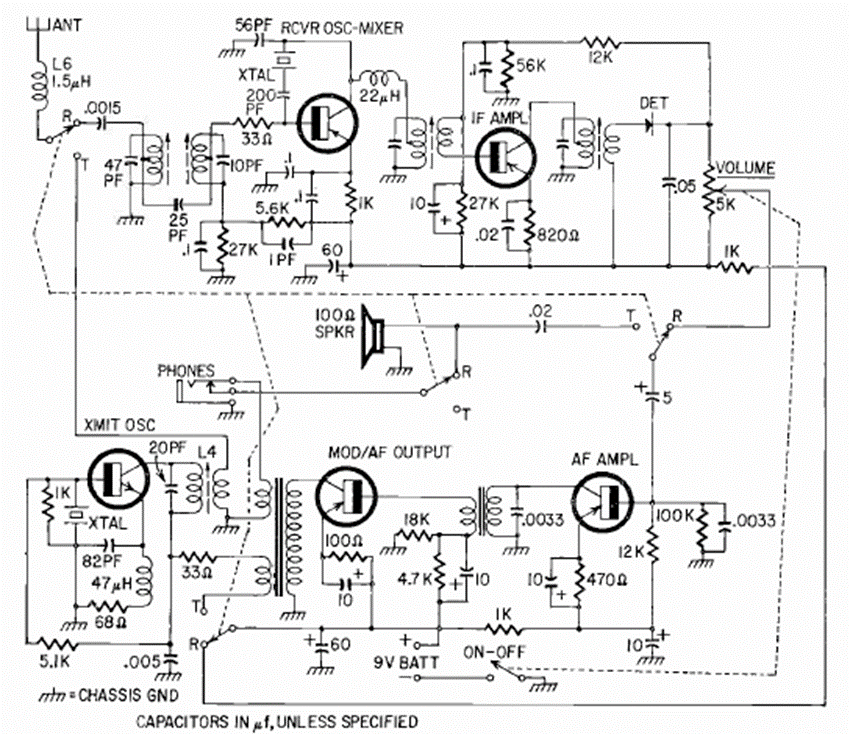 Este es el circuito transceptor de un kit Knight vendido en junio de 1964. El circuito de 5 transistores funcionaba en la banda de 27 MHz con poca potencia y se alimentaba de una batería de 9 V. Los transistores son de la época y la frecuencia está controlada por un cristal.