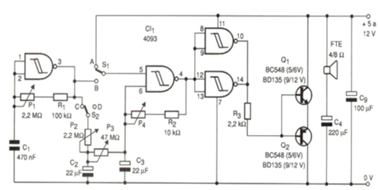 Es un juguete interesante que contiene varios potenciómetros e interruptores, lo que permite a los niños crear los más diversos efectos de sonido. El circuito completo se muestra en la figura. Este circuito también se puede utilizar en fiestas y estaciones de radio para crear algunos efectos o para llamadas: en este circuito tenemos dos osciladores interdependientes formados alrededor de dos de las puertas NAND del 4093. El primer oscilador genera intermitencias que están controladas por los interruptores P, As S1. y S2 aplica la señal de este oscilador al siguiente oscilador, que genera un tono de audio cuya frecuencia está controlada por P4. Cuando el interruptor S2 está en la posición C, la señal de este oscilador pasa a través de otros dos potenciómetros P2 y P3, que forman una red capaz de controlar la modulación del segundo oscilador. Ajustar todos los potenciómetros en combinación permite crear los más diversos tipos de sonidos. La señal final obtenida es amplificada digitalmente por las otras dos puertas del 4093 y aplicada a una etapa de potencia con transistores complementarios. Este paso entrega una buena señal de audio a un altavoz pequeño. El circuito se puede alimentar con voltajes a partir de 6 V, obtenidos de cuatro baterías. Para mayor tensión se debe utilizar una fuente de alimentación y sustituir los transistores por los indicados en el diagrama, estando montados sobre disipadores de calor.