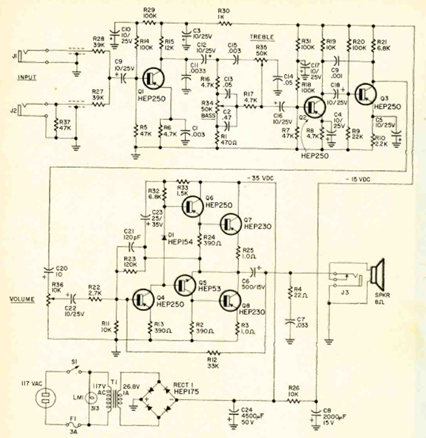 Este amplificador de guitarra a transistores apareció en la revista Radio Electronics en noviembre de 1968. El circuito de dos entradas incluye una potente fuente de alimentación. Los transistores de salida deben estar equipados con disipadores de calor.
