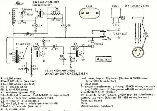 Este circuito es de la revista Radio Electronics, junio de 1958. El rango sintonizado en ese momento era de alrededor de 40 MHz. El circuito se escucha con auriculares de alta impedancia.