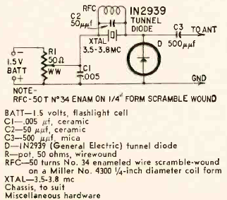 Este transmisor para CW en la banda de 3,5 MHz de baja potencia fue publicado en la revista Radio Electronics en marzo de 1961. El circuito tiene pocos componentes y se alimenta con una batería de 1,5 V.
