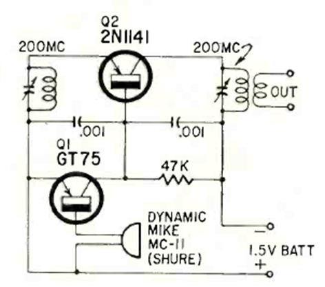 Este transmisor VHF se encontró en la revista Radio Electronics de junio de 1964. El transistor es un transistor de RF de la época y puede ser reemplazado por un equivalente moderno.