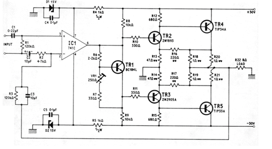 Este circuito se obtuvo de una publicación antigua de 1974, pero aún se puede ensamblar con algunos cambios de componentes. TR2 puede ser un BD135, TR1 un BC548 y TR3 un BD136. La fuente debe proporcionar una corriente de al menos 2 A y los transistores de salida deben estar equipados con radiadores de calor. Tenga en cuenta que la fuente es simétrica.