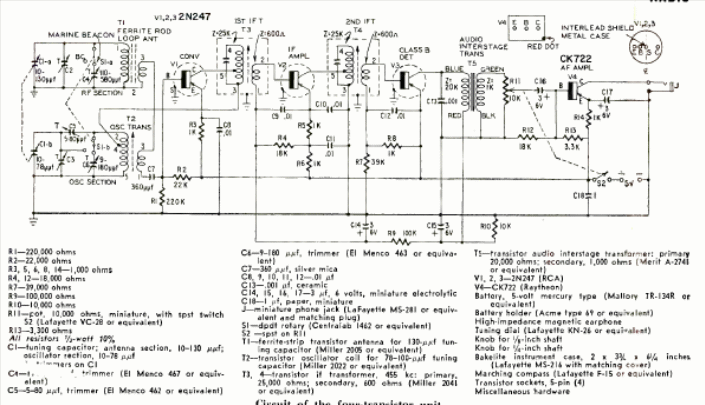 El montaje de este interesante circuito apareció en la revista Radio Electronics de junio de 1958. Combinando dos circuitos de sintonización en uno mediante antenas direccionales de ferrita, anulaba las señales en una determinada orientación, apuntando exactamente en la dirección de donde procedían.