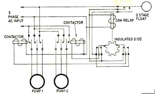 El objetivo de este circuito es determinar a partir de la posición del flotador cuál de las bombas funciona primero. Este automatismo fue encontrado en la revista Radio Electronics de octubre de 1961.