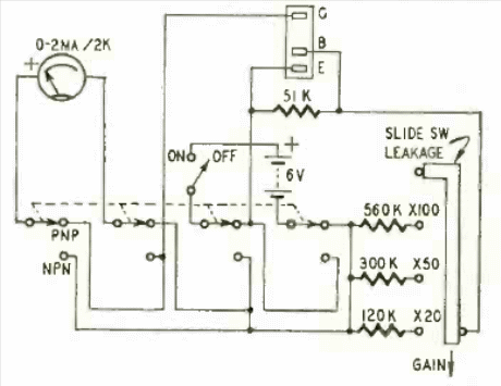 Este circuito de prueba de transistores comercial utiliza una batería de 6 V y un indicador analógico de 2 mA. El circuito está en la revista Radio Electronics de marzo de 1958.