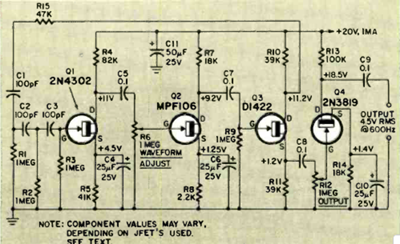 Este circuito oscilador de audio bien diseñado con 4 transistores JFET se encontró en la revista Radio Electronics de junio de 1969. El circuito produce una señal sinusoidal de frecuencia determinada por C1, C2 y C3 y por R1, R2 y R3 que se puede cambiar.
