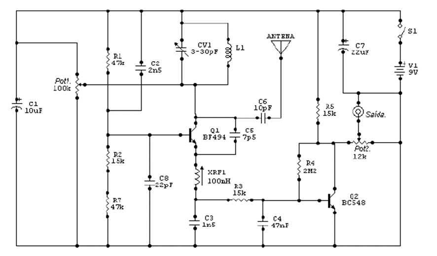 El receptor que se muestra arriba fue enviado por el lector colaborador Adriano Muniz Moura y se utiliza para la banda FM común de 88MHz a 108MHz. Se puede utilizar para experimentos en las escuelas. El circuito se basa en su oscilador, el cual está formado por la bobina L1, CV1 y el choque de radiofrecuencia XRF1. Las resistencias son de 1/8 W y los capacitores son para 25v y la bobina L1 está formada por 4 vueltas de 20 hilos de 8.5mm de diámetro sin núcleo y el trimmer es de 3-30pF fabricado en plástico de buena calidad. El transistor BF494 se puede sustituir por el BF495 y el pot 1 se utiliza para ajustar la sensibilidad del circuito, el cual debe montarse sobre una placa de fibra de vidrio y las conexiones deben ser lo más cortas posible. La antena utilizada es un trozo de cable rígido de aproximadamente 65 cm de largo y si el receptor capta mucho ruido durante el uso, el ccapacitor C6 de 10 pF se puede sustituir por otro capacitor de 15 pF también de cerámica tipo disco. La fuente de alimentación utilizada puede ser cualquiera que tenga buen filtrado y una corriente mínima de 500mA con un voltaje de 9 a 12V. La descarga de RF (XRF1) debe ser de tipo comercial de 100 mH a 120 mH o 60 vueltas de 32 cables en una resistorde 100 k. Este proyecto se puede utilizar como base para receptores más grandes o como base para receptores VHF (con pocos cambios).