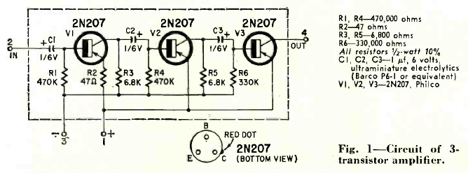 Este amplificador de acoplamiento directo que utiliza 3 transistores y potencia de bajo voltaje se encontró en la revista Radio Electronics de abril de 1961.