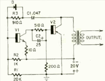 Este oscilador con transistores comunes de uso general apareció en la revista Radio Electronics de febrero de 1959. La frecuencia depende de los capacitores y la potencia proviene de una batería.