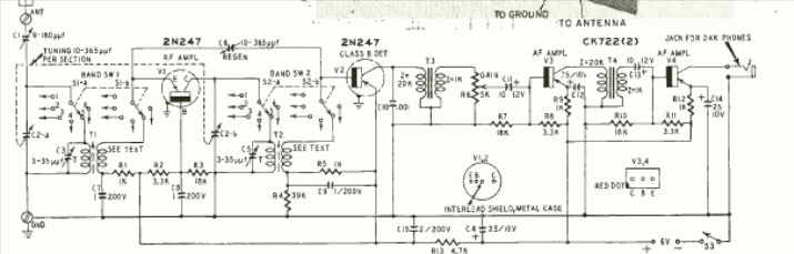 Este circuito con 4 transistores puede recibir señales en 6 bandas de ondas cortas. El circuito es de Radio Electronics de mayo de 1958. La salida es para auriculares de alta impedancia.