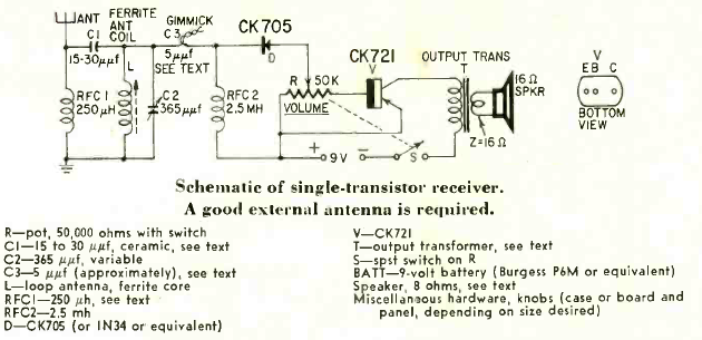 Este sencillo receptor de 1 transistor tiene escucha por altavoz. Lo encontramos en un artículo publicado en la revista Radio Electronics en octubre de 1960.