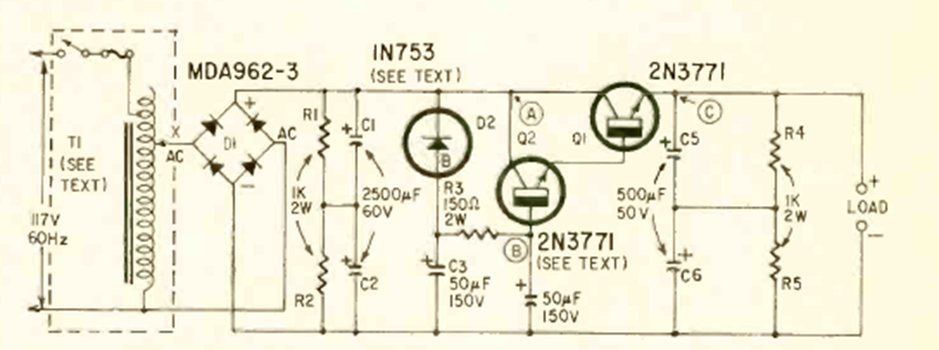 Esta fuente de alimentación fue descrita en un artículo de la revista Radio Electronics de julio de 1968. La tensión no está indicado en el texto, pero debería rondar los 100 V como máximo, ajustado por el Variac.