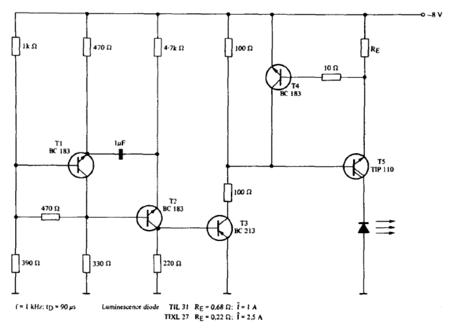 El circuito que se muestra proviene de un manual de optoelectrónica de Texas Instruments. RE depende del voltaje máximo soportado por el LED. Observe la polaridad de la fuente de alimentación. Los transistores de baja potencia pueden ser BC548 para NPN y BC558 para PNP.