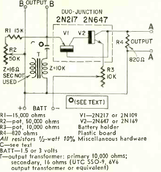 En la figura tenemos un circuito que simula un transistor unijutura en un oscilador obtenido de una Radio Electrónica de octubre de 1960. El circuito se alimenta con una batería de 1,5 o 3 V.
