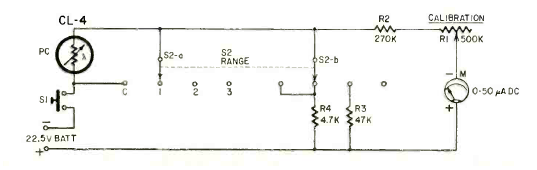 Utilizando únicamente componentes pasivos y un indicador analógico, este circuito se encontró en una Radio Electrónica de octubre de 1961. El sensor es un LDR.