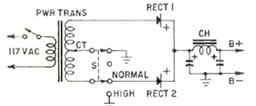 Encontramos este circuito en la revista Radio Electronics de mayo de 1962. El circuito utiliza diodos rectificadores y las tensiones de salida dependen del transformador utilizado.