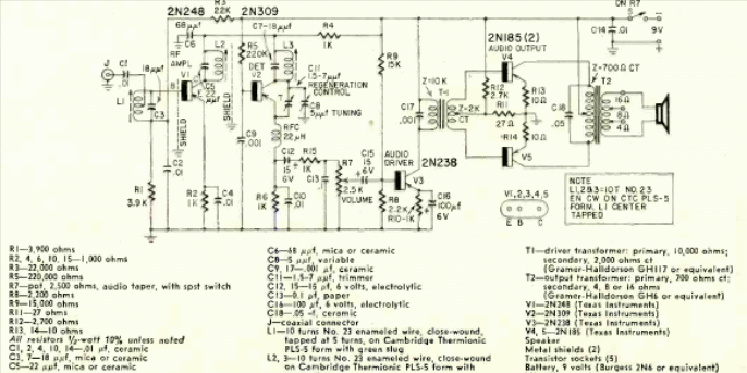 Este circuito es de Radio Electronics de febrero de 1959. El circuito tiene una salida de altavoz y buena sensibilidad. La energía es proporcionada por una batería de 9V.