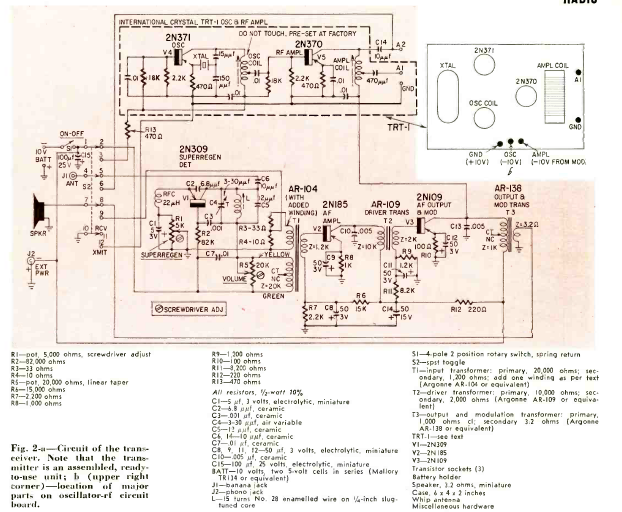 Este circuito para la banda de 27 MHz o 11 metros tuvo su montaje descrito en un artículo de la revista Radio Electronics de agosto de 1960. El circuito está completamente transistorizado.