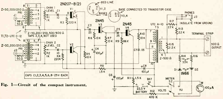 Este amplificador para dos micrófonos fue encontrado en la revista Radio Electronics de abril de 1961. El circuito funciona con baterías y tiene una salida de línea de 500 ohms.