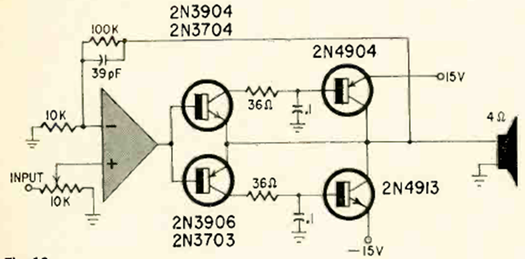 Este circuito es de un artículo sobre operacionales en una revista de Radio Electronics de alrededor de 1968. Los transistores son de la época y la potencia no es la mayor.
