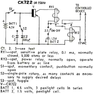 Para tiempos entre segundos y algunos minutos encontramos este temporizador con el CK722 en una revista de Radio Electronics de septiembre de 1959.
