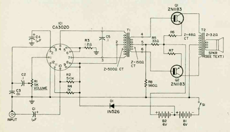 Este circuito fue encontrado en la revista Radio Electronics de septiembre de 1968. El circuito tiene dos transistores de potencia y la excitación la realiza un dispositivo integrado muy conocido en la época, el CA3020. El circuito proporcionaba unos pocos watts de salida y funcionaba con baterías.