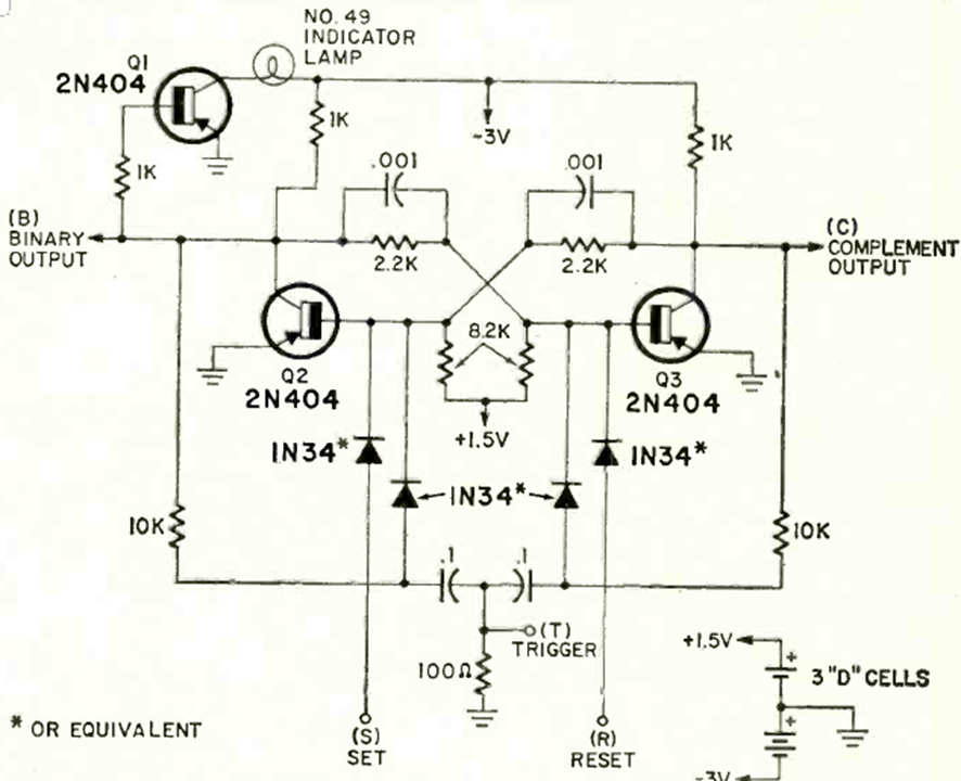Este circuito biestable bien diseñado se encontró en una documentación de 1970. Los transistores pueden ser del tipo actual y diodos de germanio. La tensión depende de la lógica utilizada y puede ser de 5 V.
