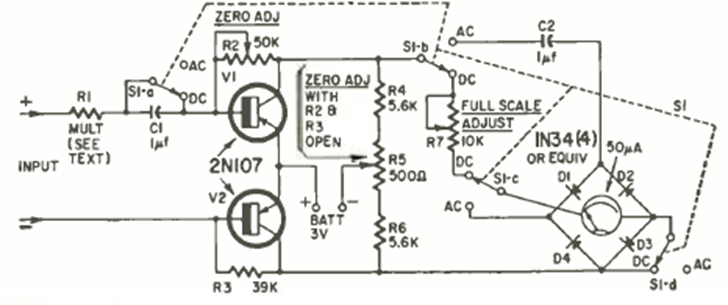 Este circuito para un instrumento o multímetro aislado puede aumentar la sensibilidad de su instrumento a 200.000 ohms por volt. Lo encontramos en una Radio Electrónica de octubre de 1962.