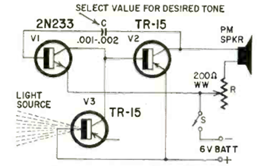 Este circuito simple publicado en la revista Radio Electronics de noviembre de 1962 emite un pitido cuando se corta la luz del sensor. Los transistores son de la época, al igual que el fototransistor.