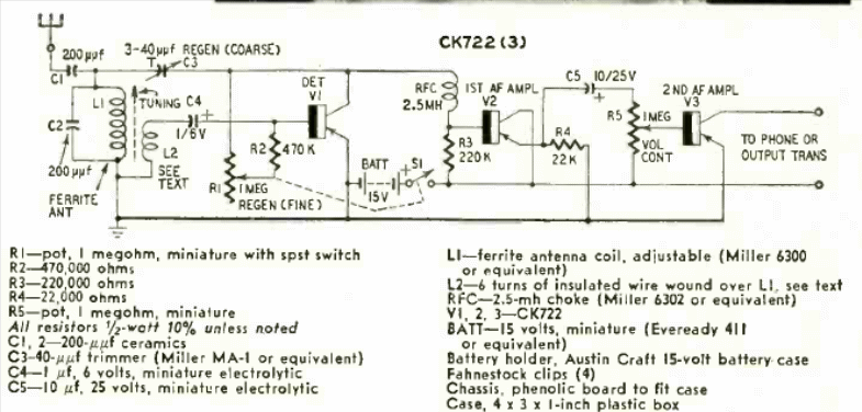 Este receptor con escucha por auriculares para la banda de onda media se publicó en la revista Radio Electronics de febrero de 1958. El circuito funcionaba con una batería de 15 V.