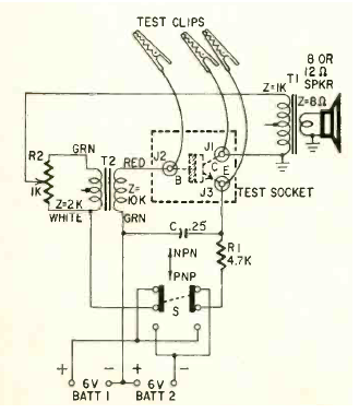 Si el circuito oscila emitiendo sonido es porque el transistor está bueno. Este sencillo probador de transistores se encontró en la revista Radio Electronics de junio de 1961.