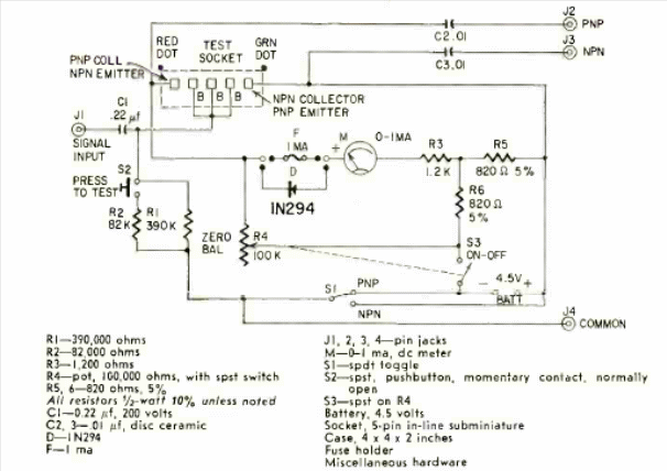Encontrado en Radio Electronics en mayo de 1959, este probador de transistores es bastante sofisticado. El circuito utiliza un indicador analógico de 1 mA.