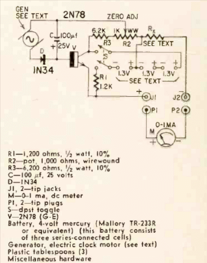 Este circuito de montaje que utiliza un pequeño motor como generador se encontró en la revista Radio Electroics de septiembre de 1978. El circuito funciona con 3 baterías.
