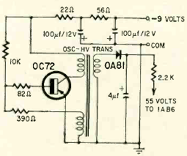 Este circuito inversor de voltaje es de Radio Eklectronics de octubre de 1965. Se usaba en radios híbridas en ese momento. El transformador determina la tensión de salida.