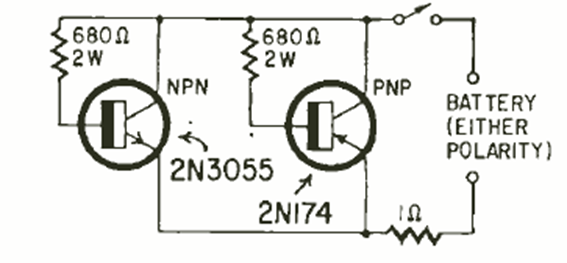 Este circuito consta de una carga controlada para descargar las baterías bajo prueba. El circuito es de Radio Electronics de abril de 1966. El 2N3055 comenzó a hacerse popular en esta época. Debe montarse en un disipador de calor.