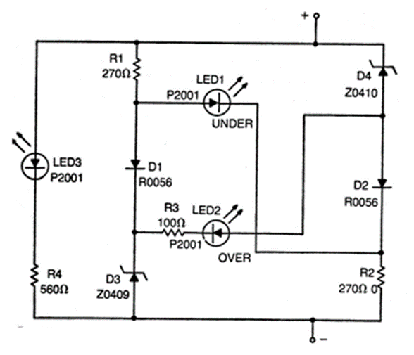 Este circuito proviene de documentación técnica antigua y se utiliza para controlar la tensión de una batería de 12 V. El circuito utiliza zeners de 6,8 V (D3) y 7,5 V (D4). De resto, los diodos son comunes y los LED son de distintos colores. El circuito indica que una batería con más de 3,6 V está cargada. El circuito se puede modificar para monitorear otros rangos de tensión.