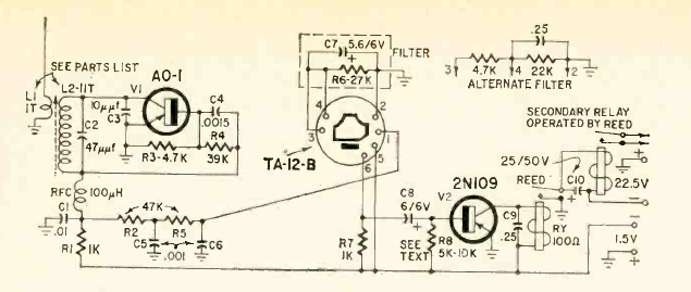 Este circuito de control remoto se encontró en la revista Radio Electronics de junio de 1962. Acciona un relé y funciona con baterías. Los transistores son tipos de la época.