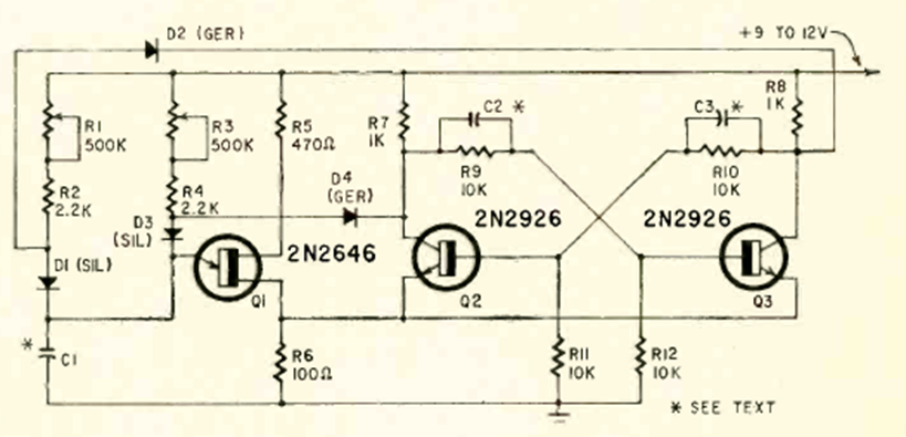 Encontramos este circuito en una Radio Electrónica de julio de 1968. El circuito genera pulsos rectangulares con una amplitud dada por la tensión de alimentación.