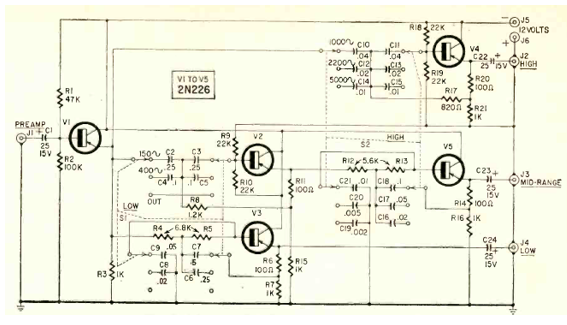 Encontramos este crossover activo en una revista de Radio Electronics de junio de 1961. Tenga en cuenta los diferentes rangos de ajuste. La señal debe aplicarse a la entrada del amplificador.