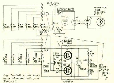 Este circuito de termistor se describió en un artículo de la revista Radio Electronics de febrero de 1963. El circuito proporciona una indicación en un galvanómetro de 200 uA.