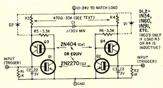 Este interesante circuito de Radio Elecronics de octubre de 1965 muestra un flip-flop o biestable con SCR simulados por transistores bipolares.