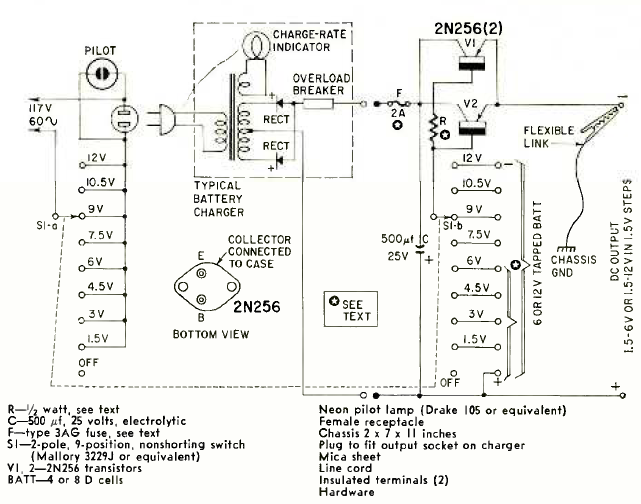 Esta fuente de alimentación de mesa con diferentes tensiones de salida de 1,5 a 12 V se encontró en la revista Radio Electronics de agosto de 1960. El circuito utiliza transistores de potencia de la época.