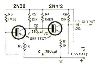 Este útil inyector de señal de dos transistores se encontró en la revista Radio Electronics de mayo de 1962. El circuito funciona con una sola batería de 1,5 V.