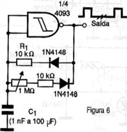 Con el circuito de la figura 6 es posible generar pulsos cuya duración viene dada por R1 y separación ajustada en el trimpot de 1 M ohmios. El capacitor C1 puede tener valores entre 100 pF y 1000 µF y la frecuencia máxima de funcionamiento para un suministro de 12 V es del orden de 2 MHz. El suministro se puede realizar con voltajes de 5 a 12 V, y la forma de onda de la salida. La señal es rectangular.
