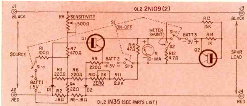 Este circuito se obtuvo de Radio Electronics en febrero de 1965. El circuito utiliza dos transistores de la época y se puede crear con transistores equivalentes modernos.