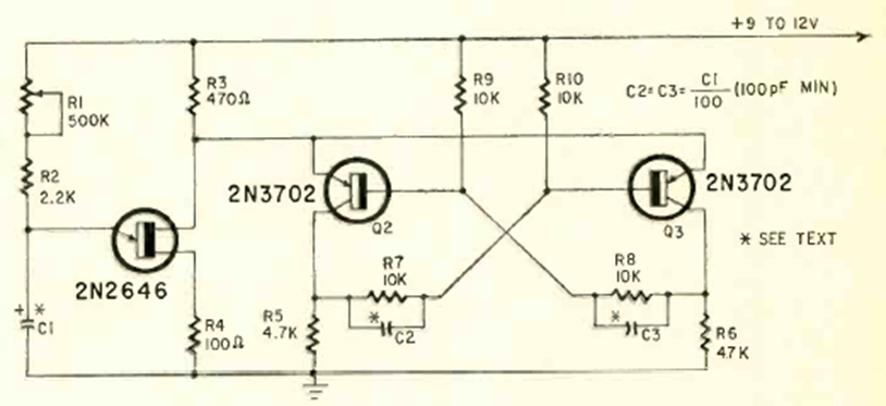 La diferencia entre este circuito y el anterior es que utiliza transistores PNP. El circuito es de la revista Radio Electronics de julio de 1968. La frecuencia depende de R1 y C1.