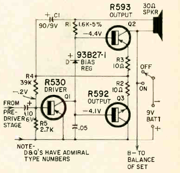Este circuito de transistor con salida complementaria apareció en la revista Radio Electronics en abril de 1963. Los transistores eran de tipo comercial en ese momento y esta etapa se usaba en una radio común.